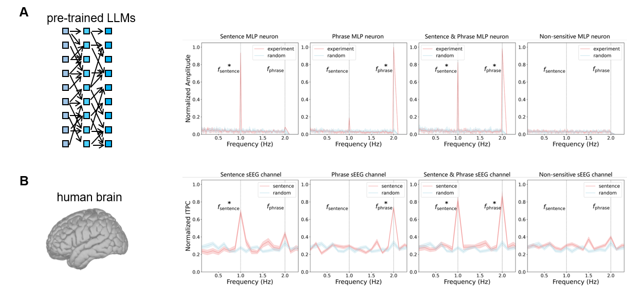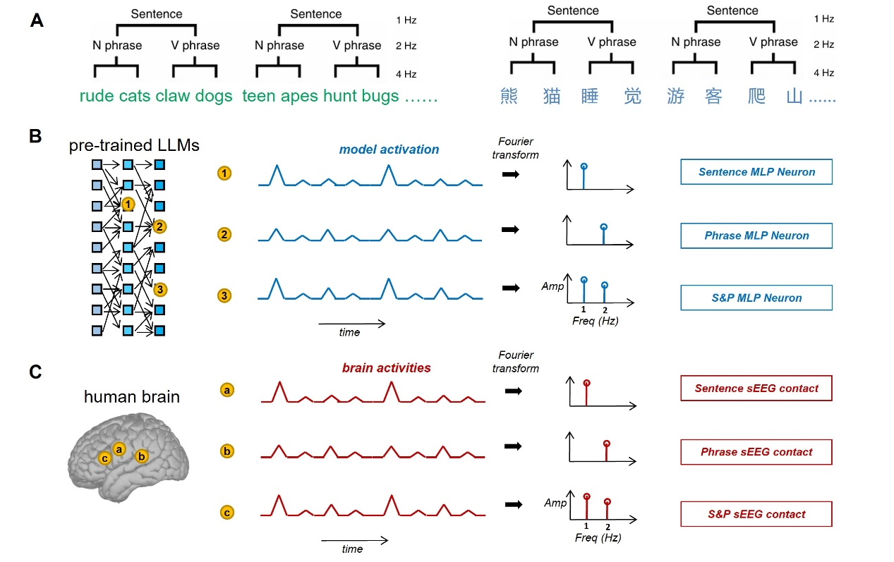 研究团队基于丁鼐等人于2016年提出的层级化频率标记(Hierarchical Frequency Tagging, HFT)方法[2],构建了中英文平行句法语料,并在人脑与大模型中同步应用。人脑实验中,研究者利用颅内立体脑电(stereo-electroencephalography, sEEG)记录人类受试者在4 Hz节奏下聆听句子的神经活动;模型实验中,研究团队为GPT、Llama、Gemma与GLM等模型构建了虚拟时间轴,并将模型内部激活信号映射到频域。结果显示,人脑和模型均在1 Hz(句子)与2 Hz(短语)频段产生稳定的特征响应,表明二者在层级化句法加工上存在共通的结构节律。