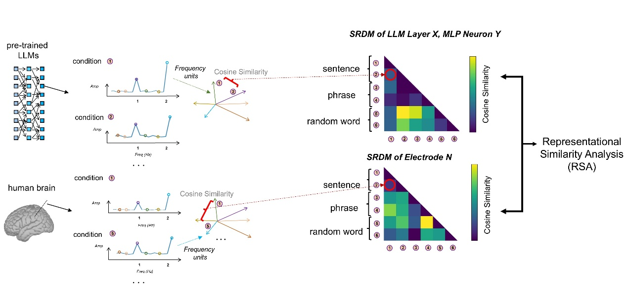 进一步分析发现,无论在生物神经系统还是人工神经网络中,都可识别出三类功能单元:分别特异性处理句子、处理短语,以及同时参与两级加工的“共享单元”。这一跨系统对应关系实现了人脑神经表征与模型内部表征在频谱空间的句法表征对齐(representational alignment),从而揭示了语言层级结构的普适规律。