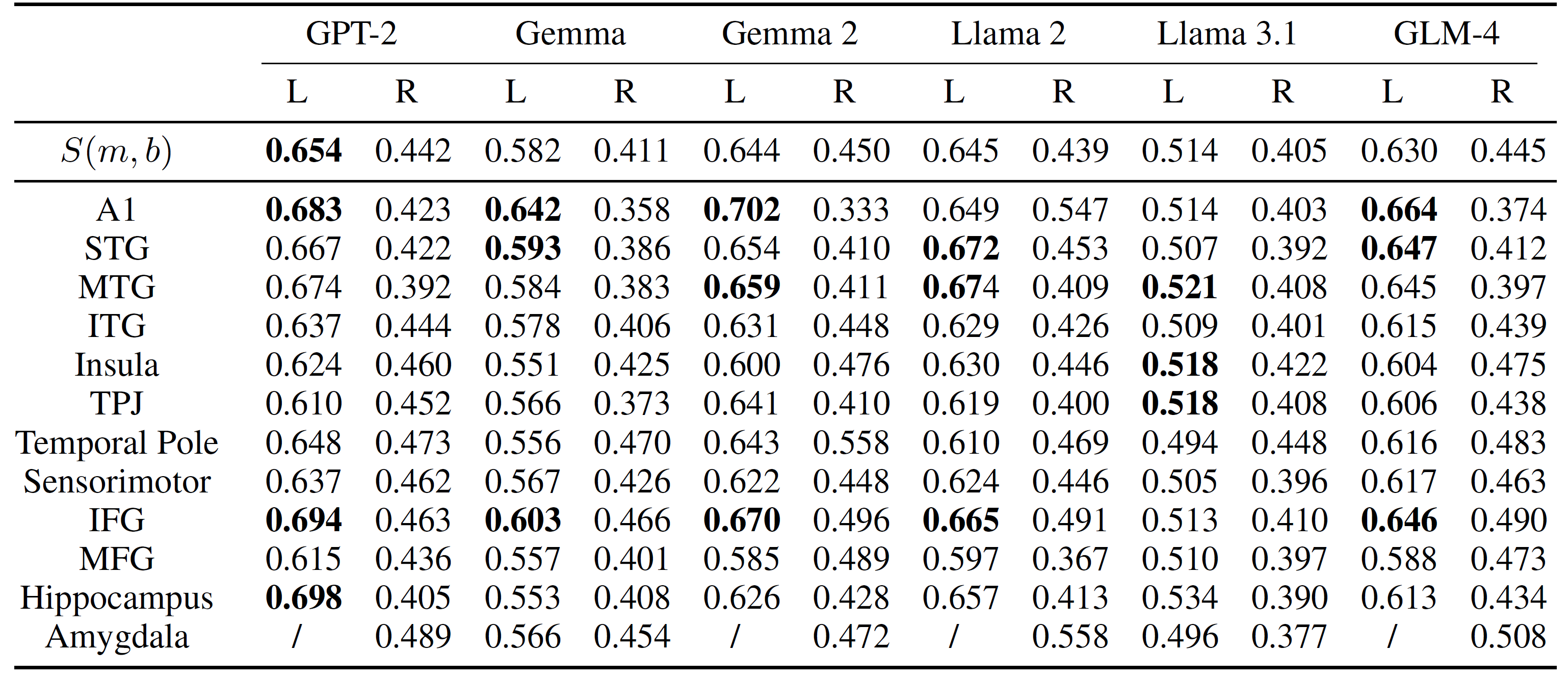 表1. 不同大模型与人脑的句法对齐表现