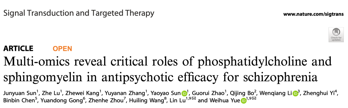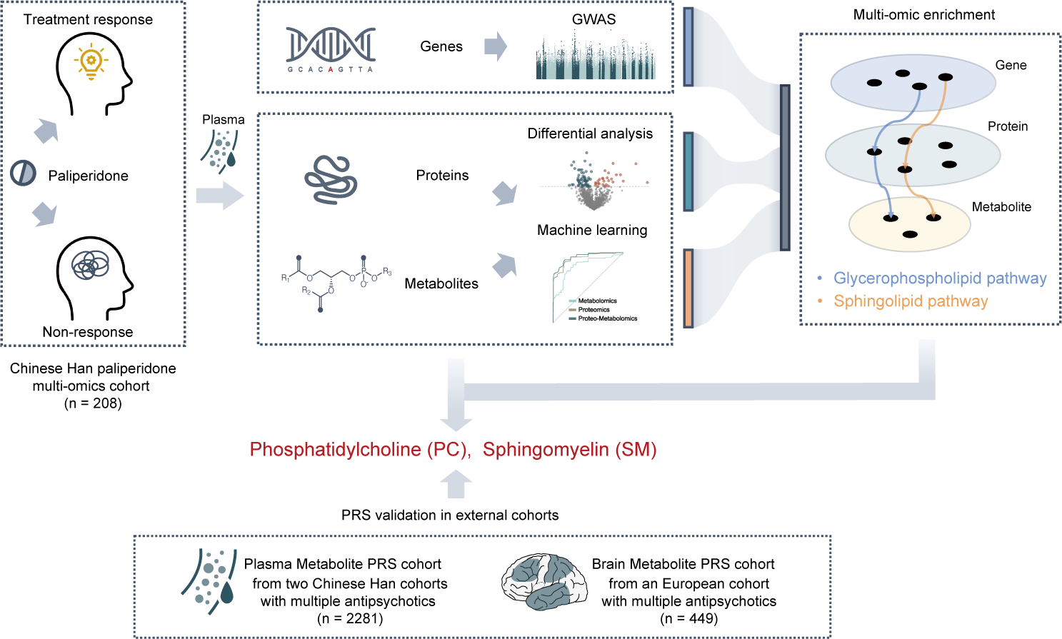 2025年10月13日,北京大学第六医院、IDG麦戈文脑科学研究所岳伟华课题组在Signal Transduction and Targeted Therapy(STTT,IF = 52.7)在线发表了题为“Multi-omics reveal critical roles of phosphatidylcholine and sphingomyelin in antipsychotic efficacy for schizophrenia”的研究。该研究整合基因、蛋白和代谢组学数据进行跨组学(Trans-omics)分析,揭示了磷脂酰胆碱(Phosphatidylcholine, PC)和鞘磷脂(Sphingomyelin, SM)在抗精神病药疗效中的关键作用,并在独立队列中得到验证,为抗精神病药疗效的机制研究及靶向干预提供了新证据(图1)。