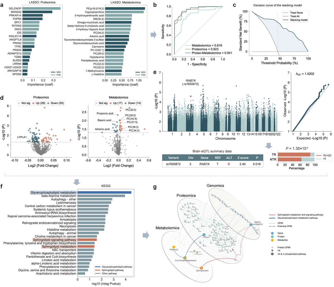 该研究首先在一项多中心帕利哌酮治疗队列中,对208例精神分裂症患者进行了基因分型、蛋白质组和代谢组学分析。机器学习分析筛选出20种疗效相关蛋白和20种疗效相关代谢物可有效预测治疗反应:蛋白质组和代谢组模型的跨中心平均AUC分别为0.923和0.816,多组学集成模型AUC达0.941。全基因组关联分析(Genome-wide association study, GWAS)及差异分析共发现32个位点、83种蛋白和31种代谢物与疗效显著关联。跨组学分析显示,这些疗效相关分子富集于甘油磷脂(Glycerophospholipid)及鞘脂(Sphingolipid)代谢通路,提示其在抗精神病药疗效中的潜在作用(图2)。