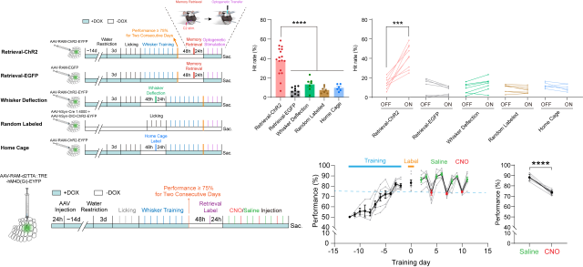 研究发现桶状皮层中RAM系统标记的活性神经元(RAM+神经元)与小鼠胡须感觉检测任务(Sensory detection task)中感觉记忆编码直接相关:激活RAM+神经元可诱发舔水行为(模拟感觉感知),抑制该群体则显著降低任务表现(图1)。不同层的桶状皮层神经元对感觉学习呈现差异化的响应模式,通过系统对比活化神经元的群体组成、电生理特性及树突棘变化等特征,作者发现感觉学习主要募集L2/3的兴奋性神经元为记忆印迹细胞,并发生特异性修饰。