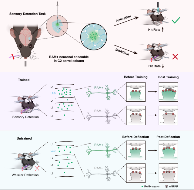 感觉学习是大脑处理信息、塑造行为和认知功能的核心过程。桶状皮层作为整合感觉信息的关键脑区在感觉记忆存储中扮演重要角色。领域内对记忆存储的机制已有初步认识,普遍认为记忆印迹细胞和突触可塑性(synaptic plasticity)共同介导这一过程;然而,记忆形成和提取过程中印迹细胞在突触可塑性层面如何变化,突触可塑性关键分子AMPA受体在此过程中是否存在神经元集群特异性的动态调控,尚未得到清晰地阐释。为此,张勇团队采用RAM(Robust Activity Marking)系统标记活性神经元集群,并结合在体双光子成像、光遗传学、化学遗传学和电生理记录等技术,探索了桶状皮层感觉记忆相关印迹细胞的突触重塑规律。