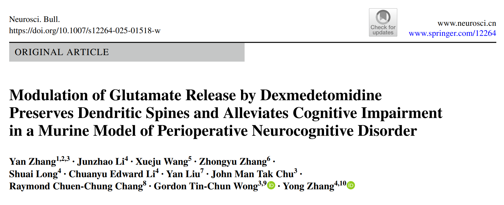2025年10月17日,北京大学基础医学院、IDG麦戈文脑科学研究所张勇课题组,与香港大学黄田镇课题组在《Neuroscience Bulletin》合作发表题为“ Modulation of Glutamate Release by Dexmedetomidine Preserves Dendritic Spines and Alleviates Cognitive Impairment in a Murine Model of Perioperative Neurocognitive Disorder” 的研究论文。本研究旨在探索在PNDs背景下参与记忆和认知功能的关键脑区,如内侧前额叶皮层(mPFC)和海马脑区谷氨酸能神经传递的作用机制。通过建立PNDs小鼠模型,综合运用行为学、分子生物学、电生理记录及双光子活体成像等技术,系统探究了PNDs的发病机制。