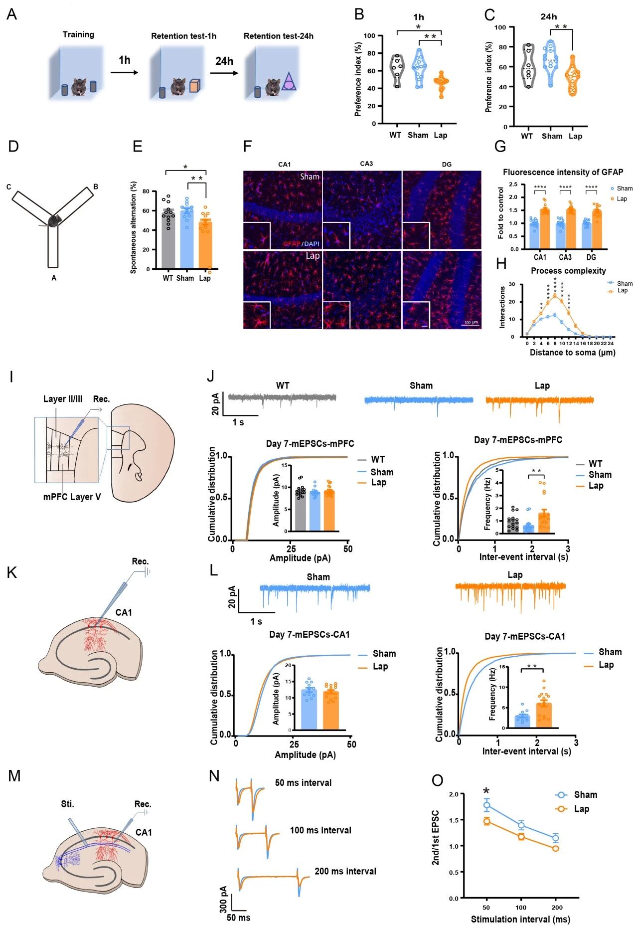 图1术后小鼠出现认知功能损伤,神经炎症反应以及突触前谷氨酸的异常释放。A-C 新颖物体识别实验结果。D-E Y迷宫实验结果。F-H 海马脑区术后星型胶质细胞荧光强度和分支。I-J mPFC脑区微小兴奋性突触后电流的频率和幅度。K-L 海马CA1脑区微小兴奋性突触后电流的频率和幅度。M-O 谢弗侧支通路的Pair-pulse ratio。