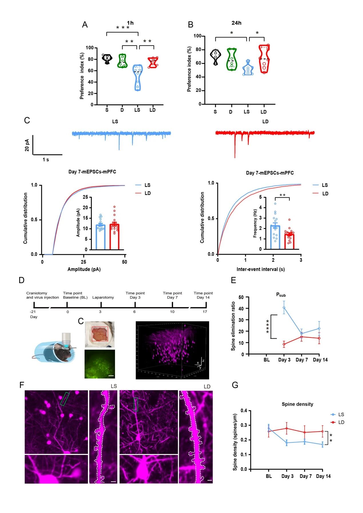 研究人员发现mPFC和海马脑区谷氨酸能神经传递异常是导致术后认知功能障碍的重要因素。术后小鼠出现认知损伤(图1A-1E),mPFC和海马CA1脑区神经元微小兴奋性突触后电流(mEPSCs)频率增加(图1I-1L),该增加可以持续至14天,但对抑制性神经传递无显著影响,手术还可增强谢弗侧支通路突触前终末的谷氨酸释放(图1M-1O)。此外,腹部手术会激活小胶质细胞和星形胶质细胞(图1F-1H),导致中枢炎症标志物水平升高,并降低兴奋性氨基酸转运体2(EAAT2)的表达。