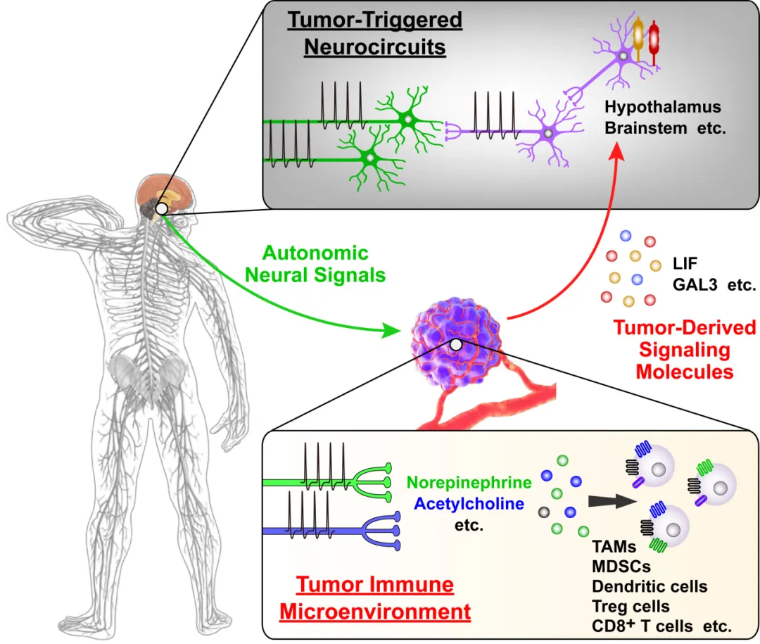 越来越多的临床证据和基础研究表明,肿瘤病理过程与神经系统之间存在密切关联。正因如此,肿瘤神经生物学(cancer neuroscience)这一名词自2020年在领域内首次提出以来,仅在几年间已迅速成为生物医学的前沿热点之一。值得注意的是,肿瘤神经生物学实际上有着悠久的学术历史传承,反映了生物医学对神经系统、免疫系统、循环系统、代谢系统等机体各个重要系统复杂相互作用的不断深入认识。