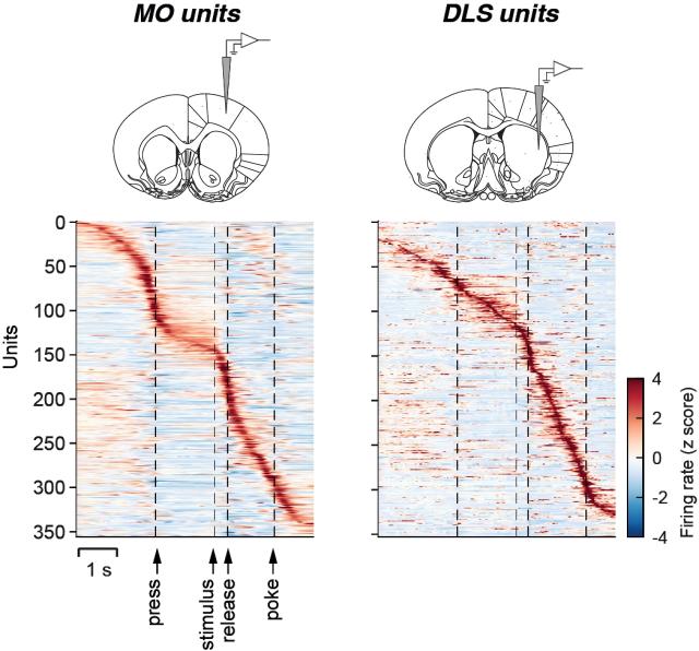在这项工作中,我们也汇报了基于慢性电生理记录观察到的皮层和纹状体神经元在行为中的放电模式,且这两个脑区的放电有较强的相似性。这些放电与动物行为的不同组分有关(如接近按杆,抬手,趋向奖励等)。事实上,当动物进行熟练的行为操作时,尤其是基于试次(trial)的结构,很多脑区都会呈现类似的放电序列,然而不同脑区对行为的贡献,则需要对这些脑区进行干扰,才可能洞察到一些线索。