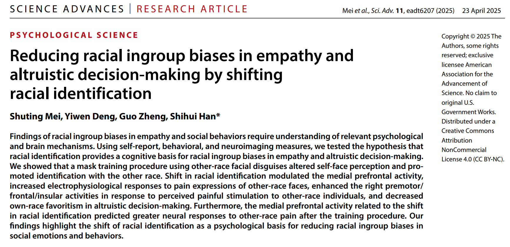 Mei, S., Deng, Y., Zheng, G., Han, S. (2025). Reducing racial ingroup biases in empathy and altruistic decision-making by shifting racial identification. Science Advances, 11, eadt6207.
