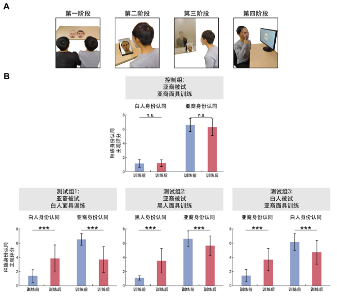 图一。面具训练任务以及面具训练任务前后对自身种族身份的主观评分。(A)两名志愿者同时佩戴他族面具(第一阶段),通过镜子观察该面孔并感受视觉-运动的同步刺激(第二阶段)。在观察另外一位同伴的新面孔后(第三阶段),完成视觉-运动-触觉同步刺激的自我指向任务(第四阶段)。(B)亚裔和白人受试者在面具训练任务后自我报告种族身份向他族转移。