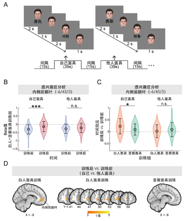图二. 面具训练任务前后对佩戴面具面孔的神经表征。(A)功能磁共振实验范式。受试者判断自己或他人佩戴面具面孔的人格特质。(B)(C)(D)大脑内侧前额叶活动在面具训练任务前后的变化。