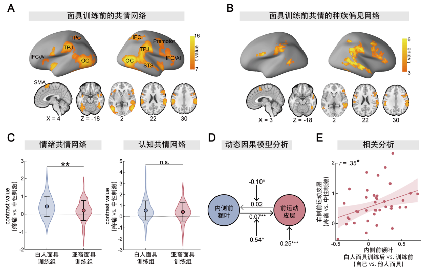 图三。面具训练任务前后共情神经活动的改变。(A)面具训练任务前与共情有关的神经活动。(B)面具训练任务前共情神经活动的本种族偏好。(C)面具训练任务主要影响情绪共情网络的神经活动。(D)(E)参与自我表征的内侧前额叶活动调控与共情相关的前运动皮层活动。